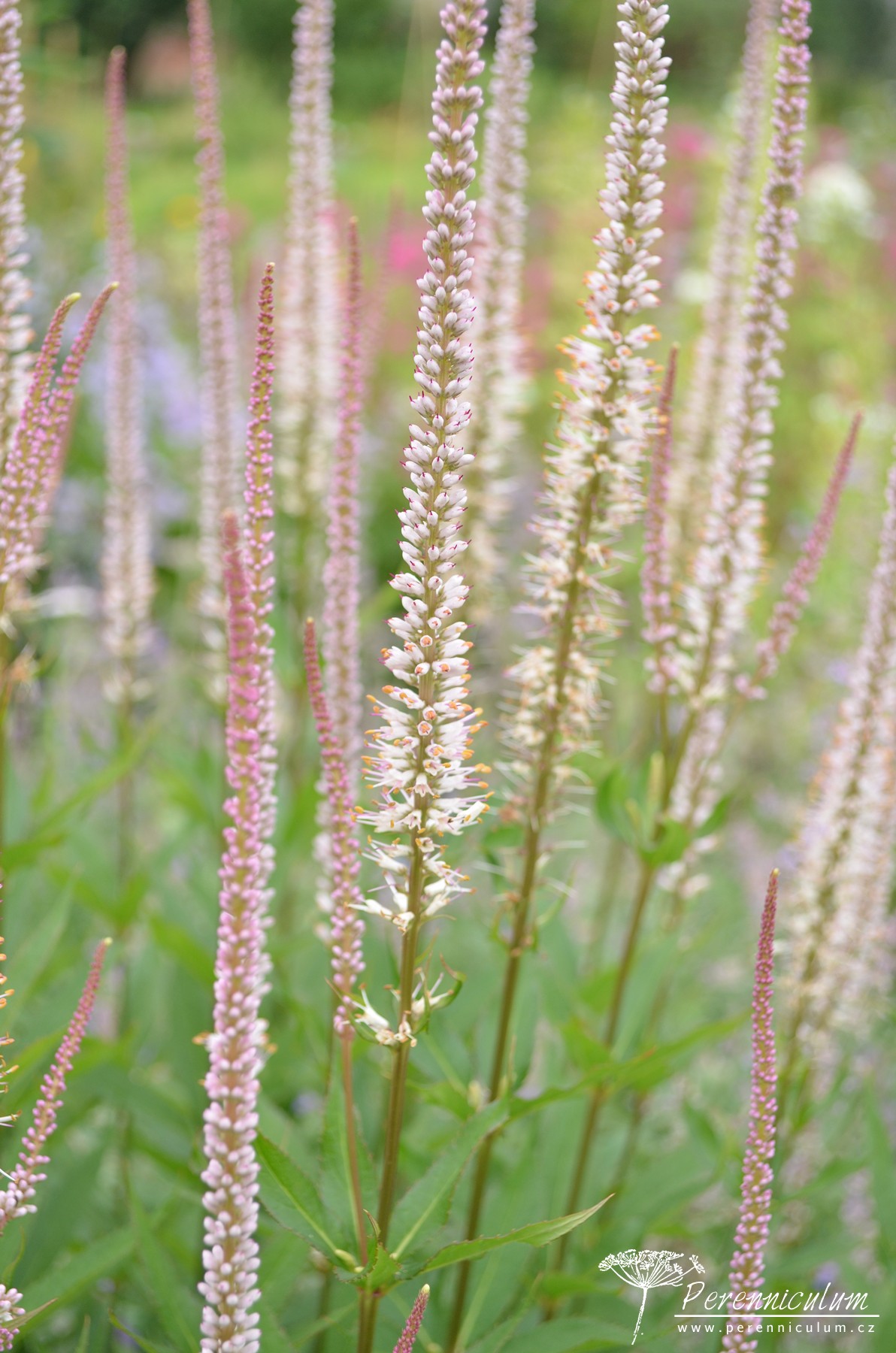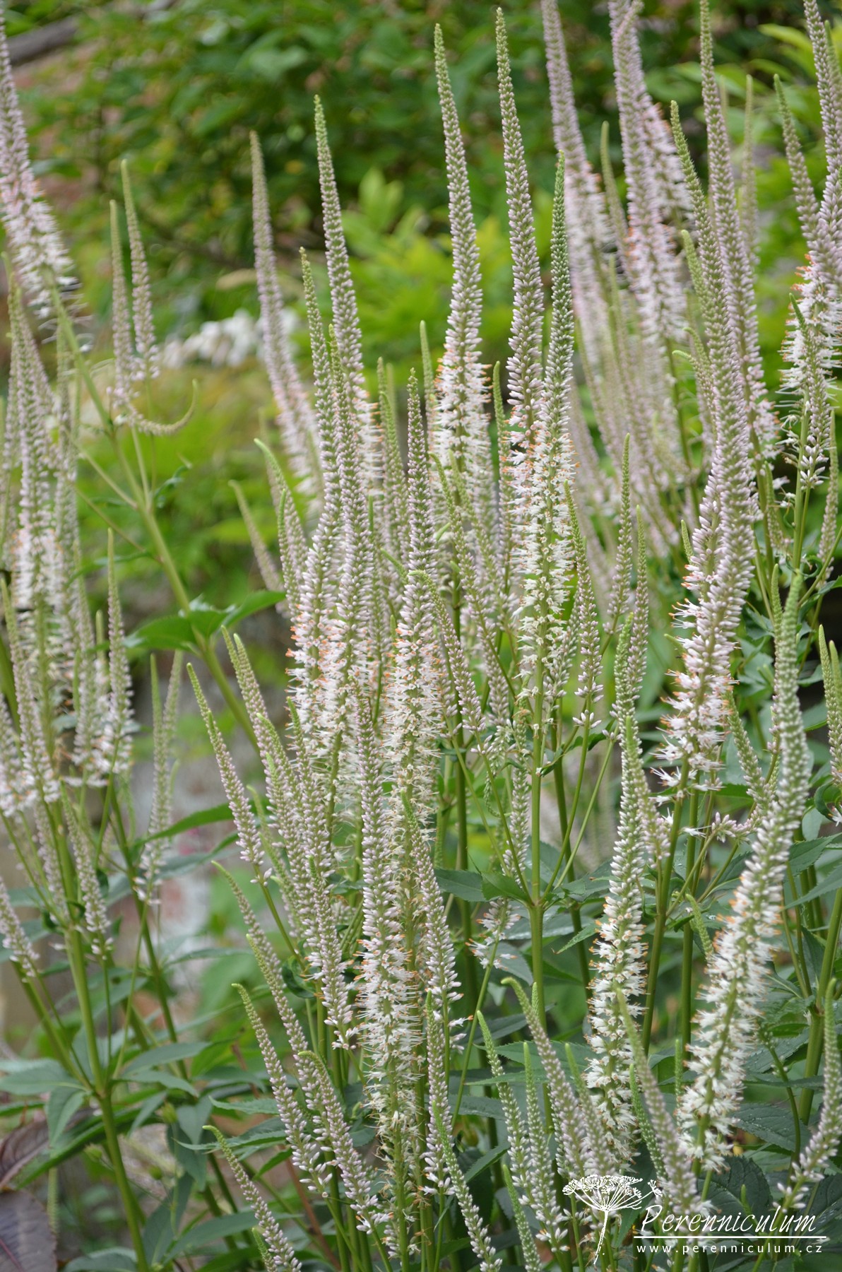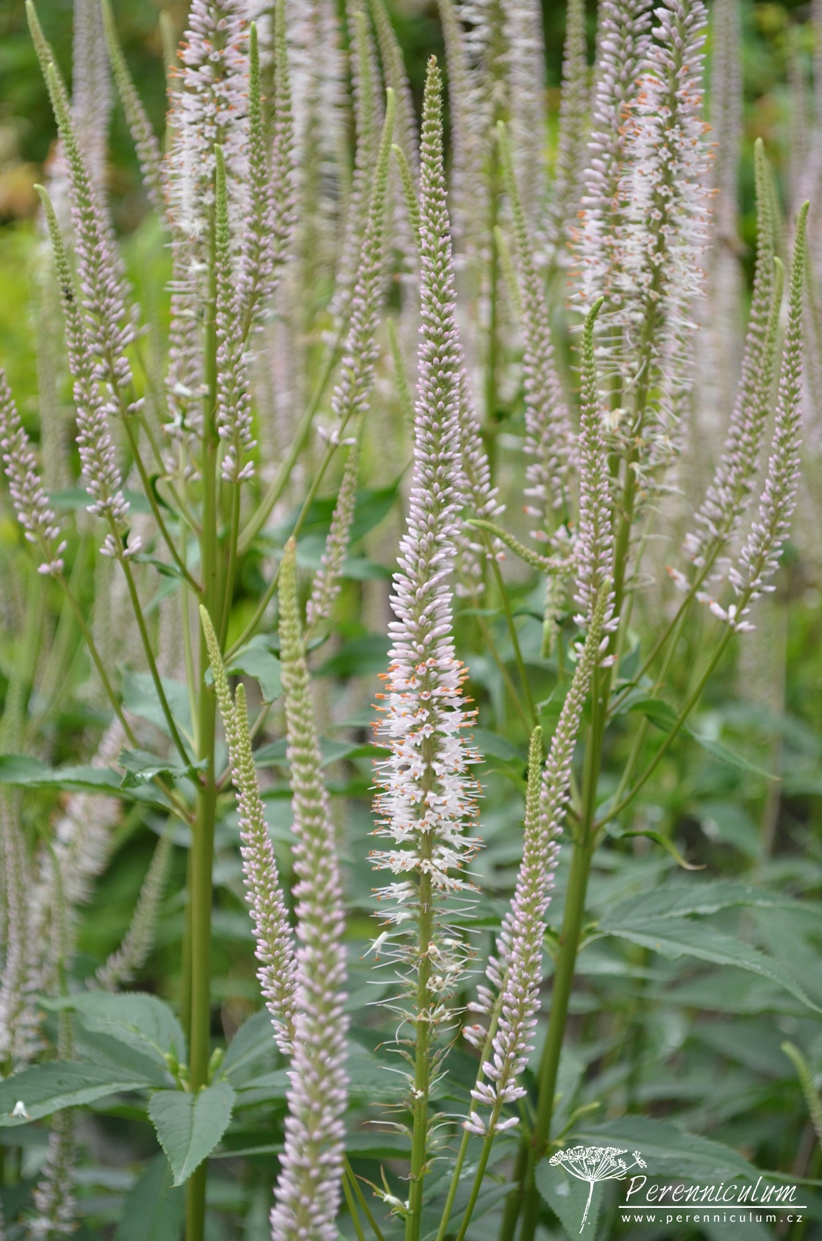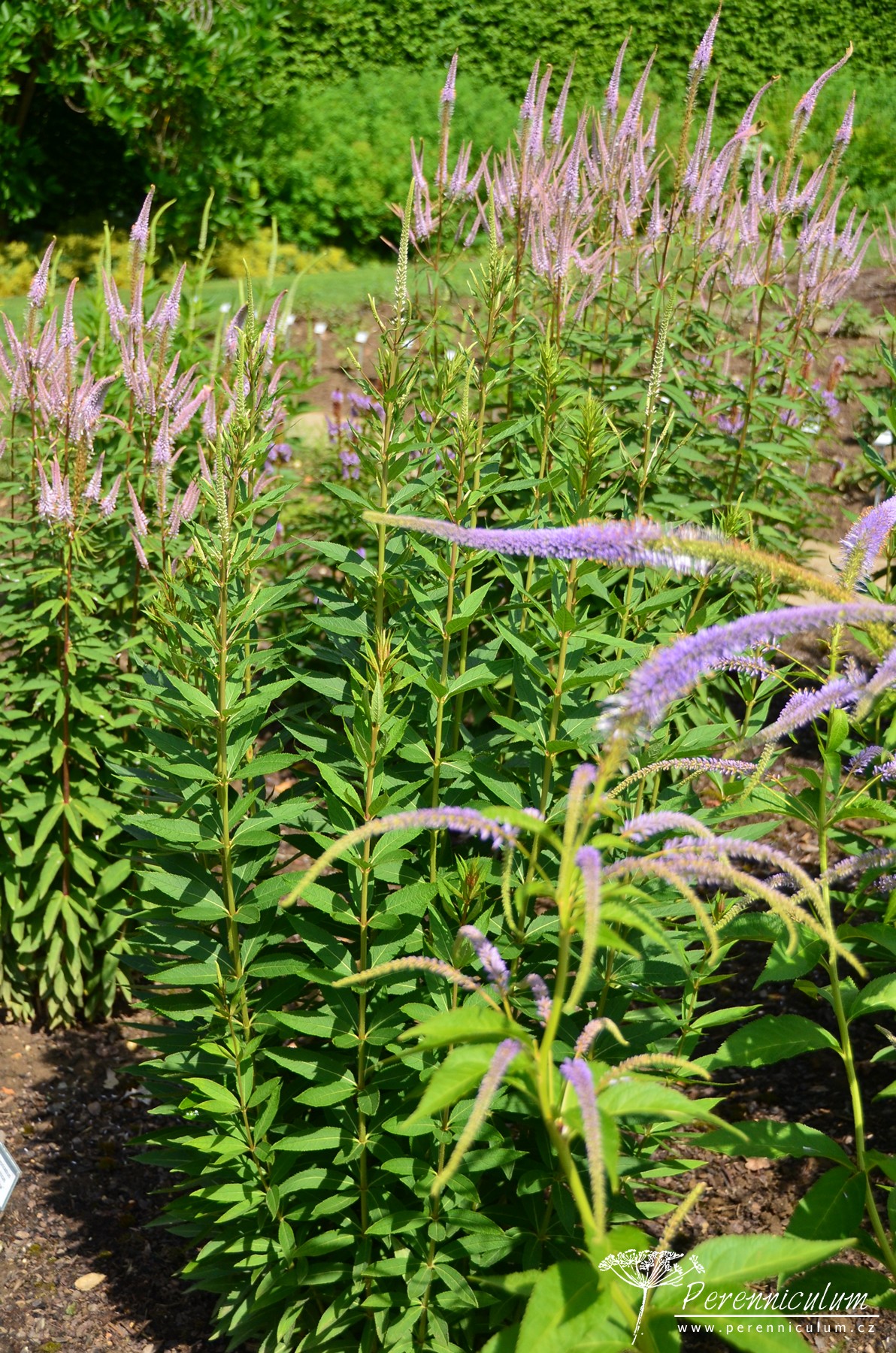 Veronicastrum virginicum je domácí trvalkou východní části Severní Ameriky, kde roste na loukách, prériích, ve světlých lesích a křovinách. Na vysokých přímých stoncích vyrůstají po 3 až 6 v přeslenech úzké, kopinaté, až 20 cm dlouhé listy. Nad posledním přeslenem listů se stonek obvykle větví, aby dal vznik několika hroznovitým, úzkým, špičatým květenstvím. Centrální (primární) hrozen se otevírá jako první a asi v půlce jeho kvetení začínají nakvétat sekundární hrozny, které jej v kruhu obklopují. Sekundární hrozny jsou obvykle kratší a užší. Květenství s poupaty se objevuje od června, ale naplno kvete až během července a srpna. Po odkvětu zůstává Veronicastrum virginicum atraktivní svými plodenstvími, která drží pohromadě (nerozpadají se) dlouho do zimy. Velmi dobře se kombinuje s vysokými trávami či trvalkami s kontrastním kulovitým květenstvím (např. Echinops ritro, Eryngium sp.). Díky své výšce se hodí spíše do pozadí perenového rabata.